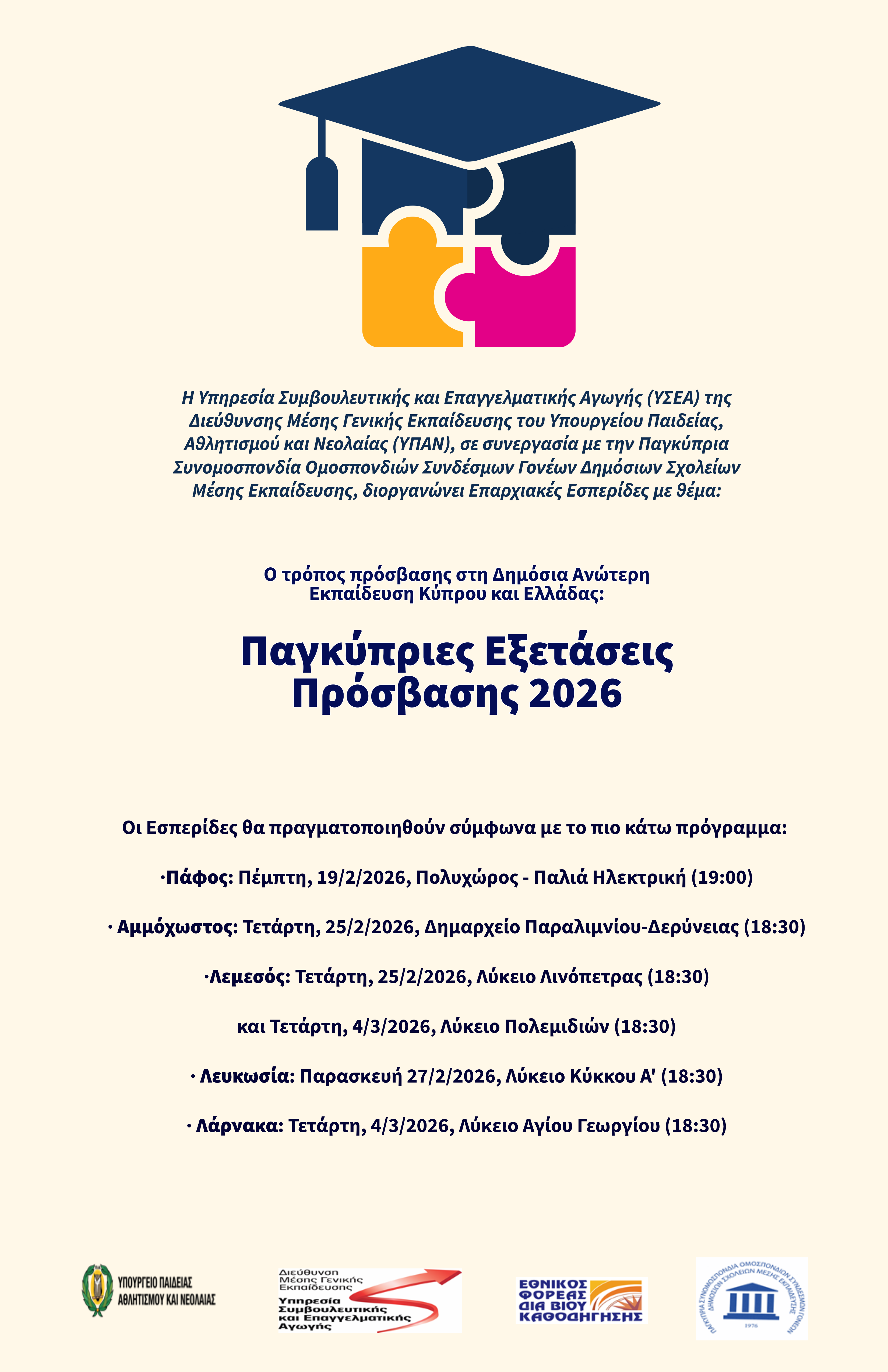 | 14.02.2026 | Επαρχιακές Συναντήσεις - Παγκύπριες Εξετάσεις Πρόσβασης 2026 Ανακοίνωση, Αφίσα |